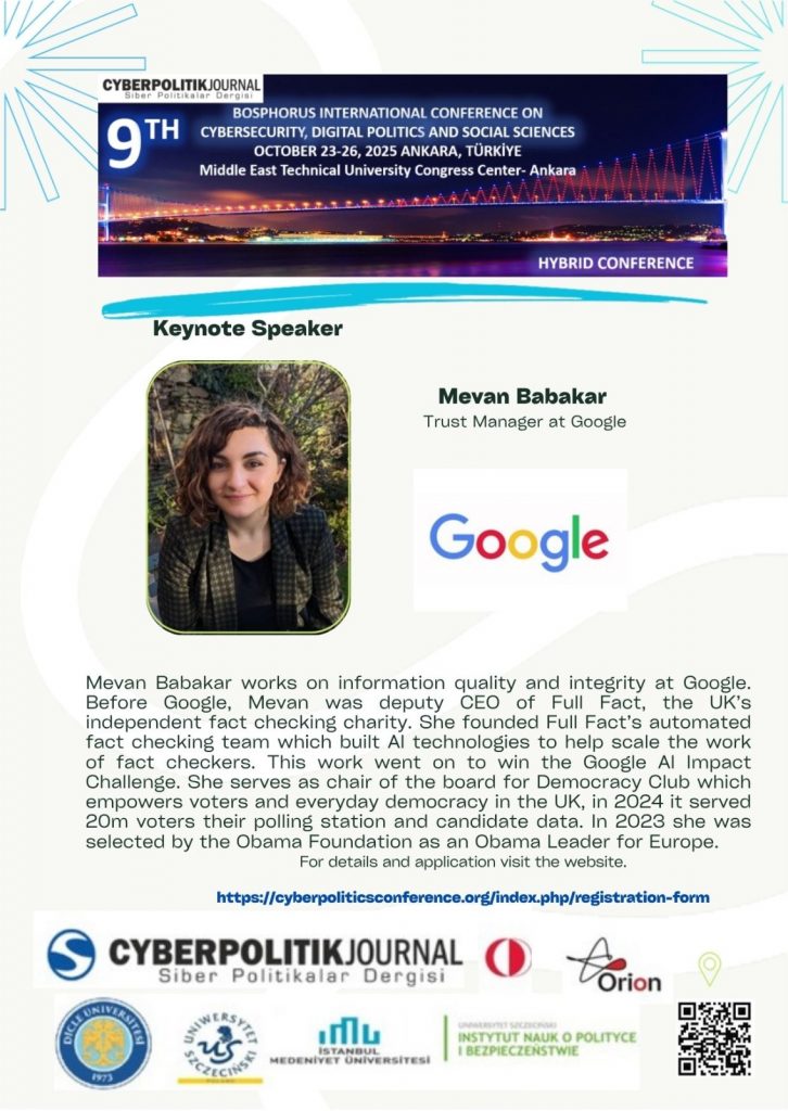 Keynote Speaker : Mevan Babakar yazar9 August 20259 August 2025 article ← The 9th Bosphorus International Conference on Cybersecurity, Digital Politics and Social Sciences will be held in Ankara, between October 23th-26th, 2025. Keynote Speaker : Janice Richardson →